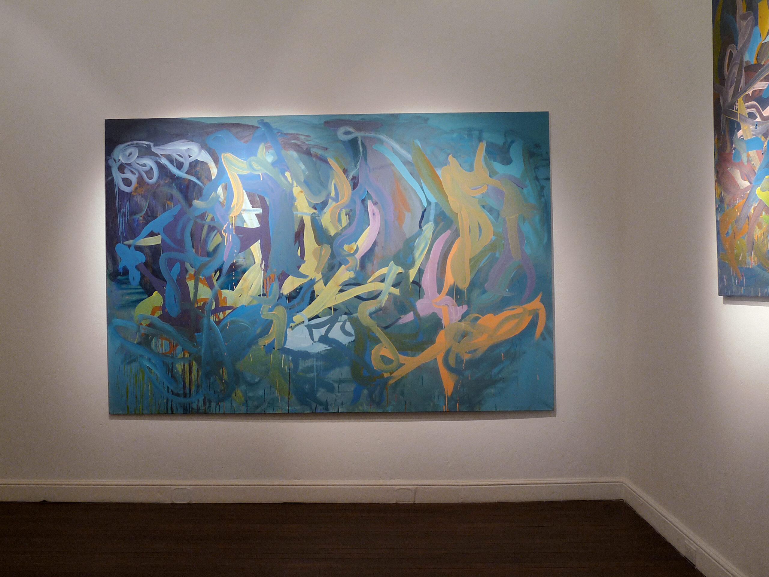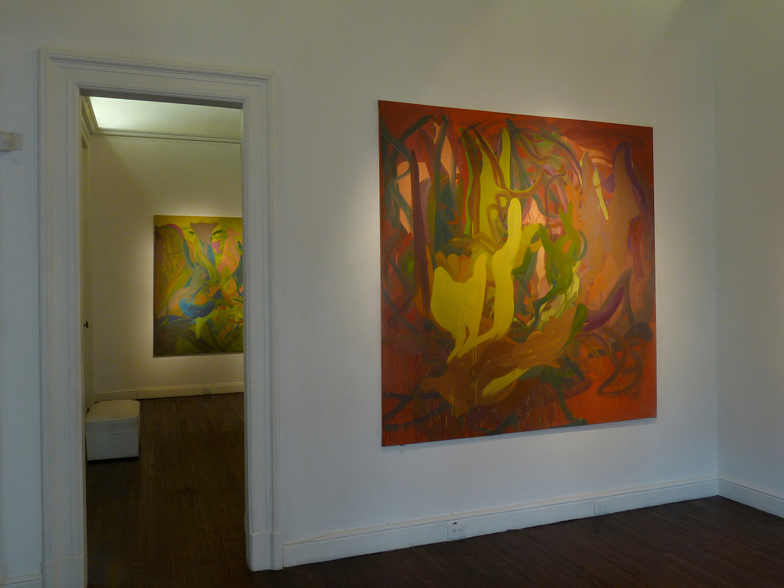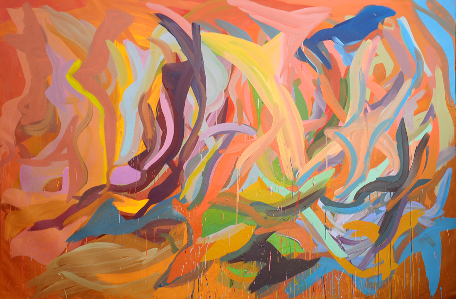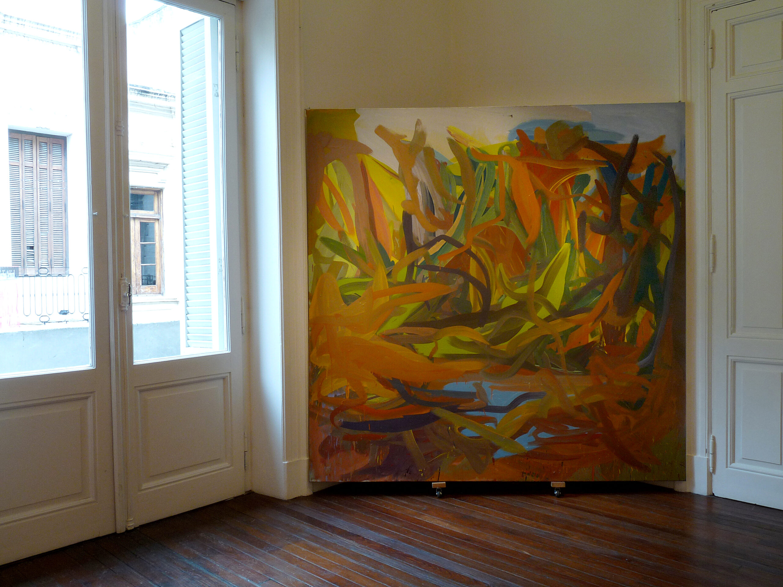 Sorans no quiere ni puede ahorrarse nada, y se interna con su ardoroso equipamiento a explorar una geografía que tiene tanto de exceso como de eficacia en la segmentación y encastre fluido de los planos, en la turbulenta lógica de las pinceladas -por momentos proporcionadamente elegantes, por momentos distorsionadas hasta la incomodidad – según las dimensiones de la tela, y en el equilibrio tenso de las opciones tonales, donde las aristas mas lumínicas del color siempre parecen ecualizadas por un velo que regula el sistema y lo sostiene en íntima cohesión. A la vez, todo parece la manifestación multiforme de un voluptuoso maelstrÖm metido a la fuerza en un rectángulo, y hecho con piezas de un rompecabezas blando, a mitad de camino entre la geometrizaciòn colapsada por el ímpetu de una vorágine deconstructiva, y la energía de un combustible híbrido que intenta amalgamar potencias en pugna, tan cerca de una suerte de fauvismo iletrado, fuera de gozne, como de una hipotética versión primitiva del clásico expresionismo abstracto.