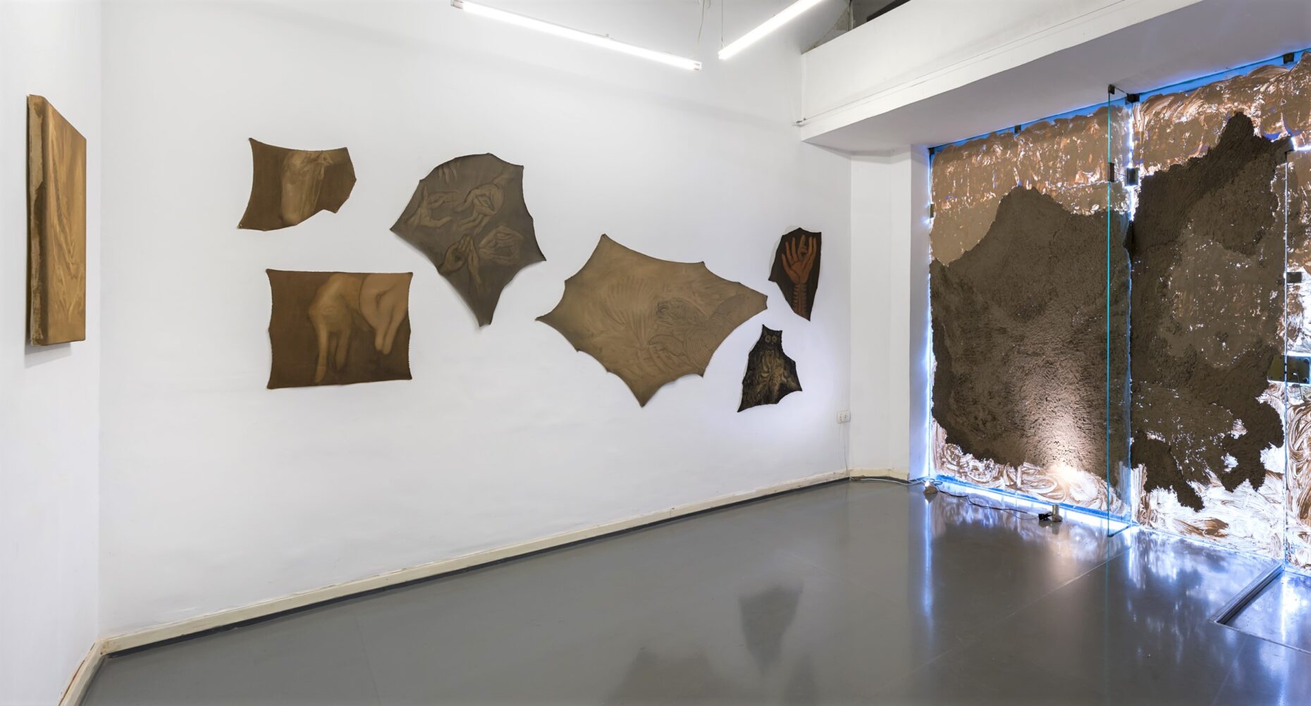 La muestra recorre tres instancias de vinculo entre cuerpo y tierra. Junto al políptico de Pinturas de tierra para otro final ; una serie de piezas pictóricas realizadas a partir de tierras recolectadas; una pared de revoque de tierra sobre vidrio bloquea la visión traslucida de la vidriera y la comunicación con la calle. Inducir la cueva, primigenio refugio.